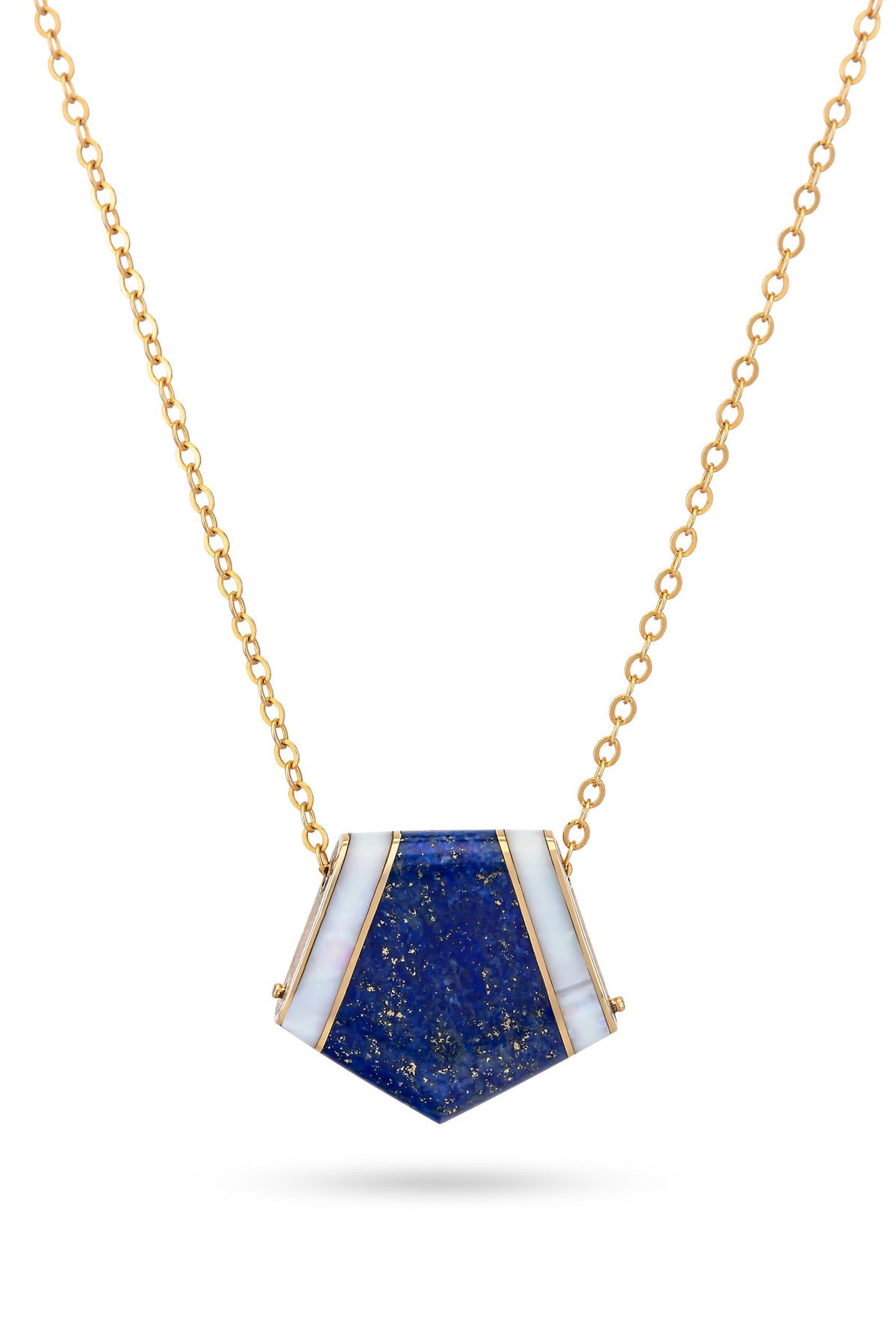 “Nefertiti” a pendant of lapis lazuli and Ethiopian opal, with 18-karat gold.